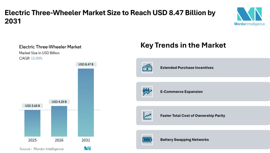 Electric Three-Wheeler Market Size to Reach USD 8.47 Billion by 2031, Amid Expanding Fleet Demand and Battery Swapping Adoption- Mordor Intelligence