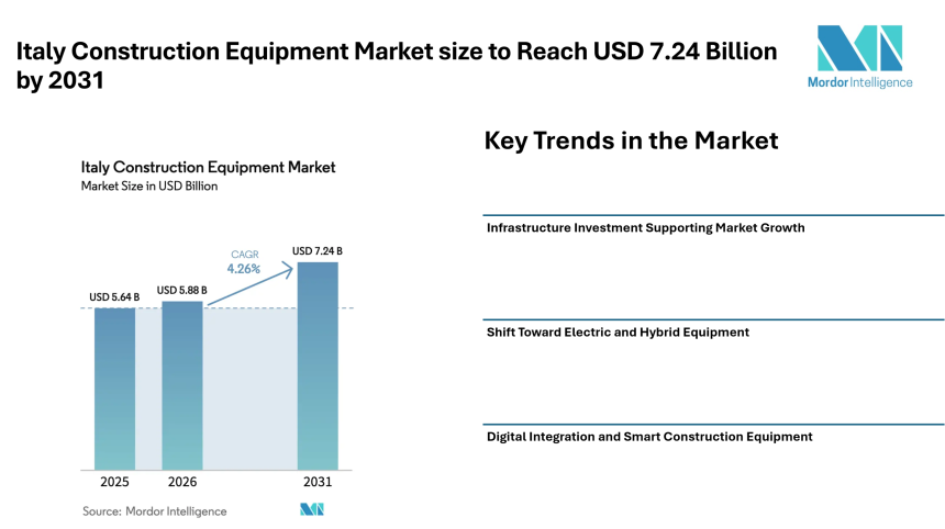 Italy Construction Equipment Market size to Reach USD 7.24 Billion by 2031 Driven by Infrastructure Spending, Green Equipment Demand, and Digital Construction Practices – Mordor Intelligence