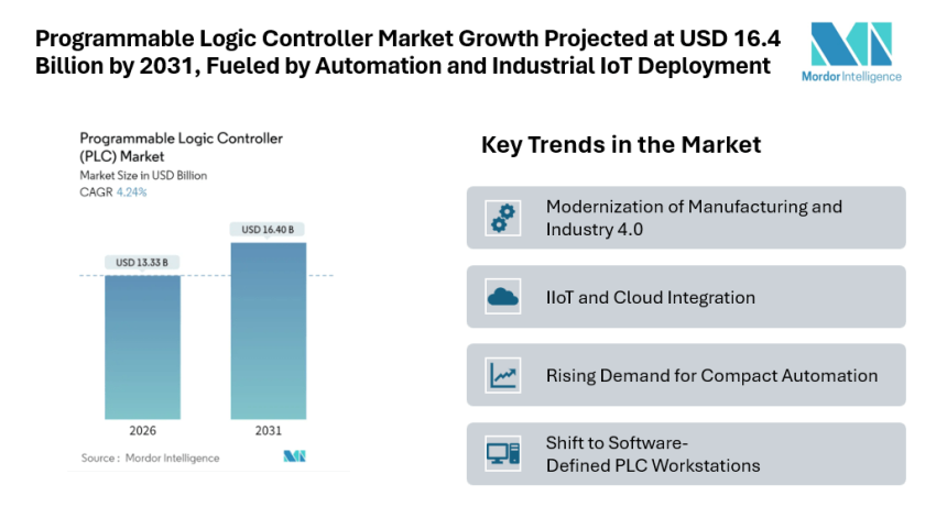 The global Programmable Logic Controller (PLC) Market is witnessing steady growth, with market size expected to rise from USD 13.33 billion in 2026 to USD 16.4 billion by 2031.