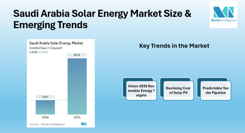 saudi arabia solar energy market is set for rapid growth, with installed capacity rising from 13.47 GW in 2026 to 52.72 GW by 2031 at a CAGR of 31.4%, driven by Vision 2030 targets and competitive solar tariffs