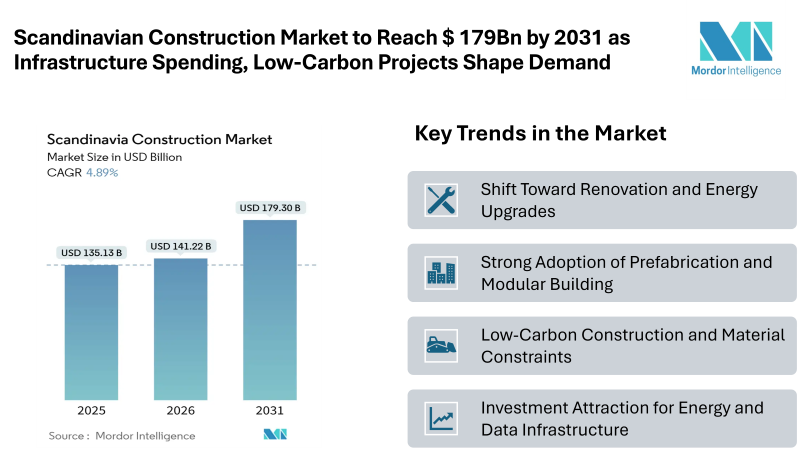 According to Mordor Intelligence, the Scandinavian construction market size was valued at USD 135.13 billion in 2025 and is estimated to grow from USD 141.22 billion in 2026 to reach USD 179.3 billion by 2031, registering a CAGR of 4.89% during the forecast period (2026–2031). The Scandinavian construction industry is entering a phase where public investment, energy transition projects, and renovation programs are driving activity more than speculative housing development. Governments across the region are prioritizing transportation links, defense-related facilities, renewable energy hubs, and modernization of aging infrastructure, creating stable long-term demand in the Scandinavian construction market.